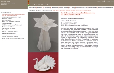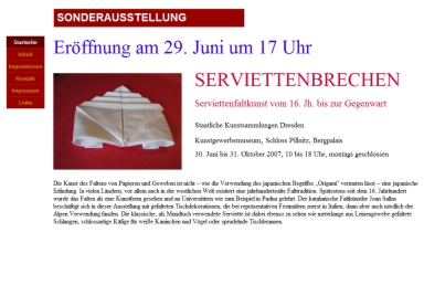 Am 29.06.07 fuhr ich zum Kunstgewerbemuseum im Schloss Pillnitz nach Dresden. Die Museumsleitung hatte mich zur Eröffnung der Ausstellung "Servietten brechen". Serviettenfaltkunst vom 16.Jahrhundert bis zur Gegenwart" eingeladen. Dank der unermüdlichen Forschungsarbeit von Joan Sallas und durch die Unterstützung des Kunstgewerbemuseums wurde diese Ausstellung realisiert.